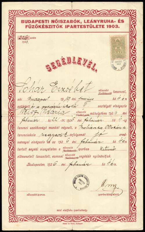 Beschreibung: 1936 Budapesti Nőiszabók, Leányruha- és Fűzőkészítők Ipartestülete által kiállított segédlevél, 50 f okmánybélyeggel, a hajtás mentén szakadással