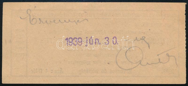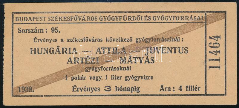 Beschreibung: 1938 4 filléres értékjegy, érvényes 5 budapesti gyógyforrásnál 1 l gyógyvízre, szép állapotban, hátoldalt érvényességi dátummal