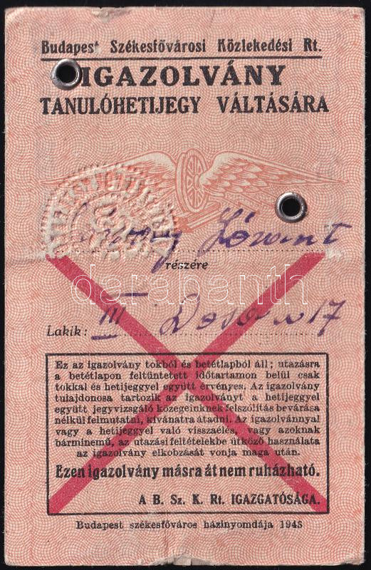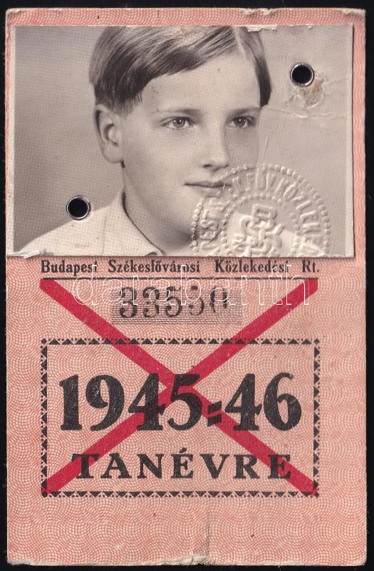 Beschreibung: 1945-46 Sárdy Lóránt (1931-2014) későbbi restaurátor fényképes BSZKRT igazolvány tanuló hetijegy váltására, kissé sérült