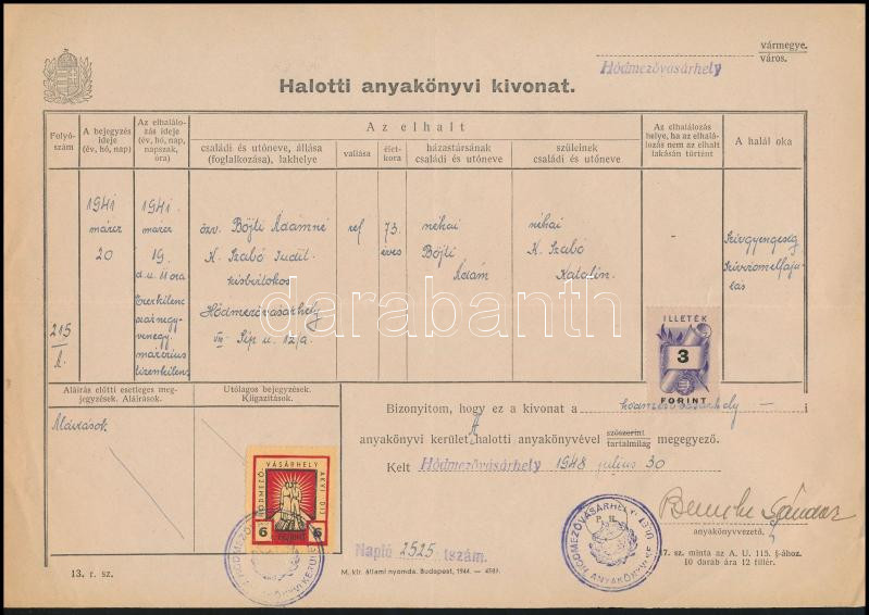 1948 Hódmezővásárhely Anyakönyvi bélyeg halotti anyakönyvi kivonaton https://www.darabanth.com/de/435-Fernauktion/435.0/Kunst-Dokumente-andere-Sammelgebiete/Dokument~500019/1948-Hodmezovasarhely-Anyakonyvi-belyeg-halotti-anyakonyvi-kivonaton~II2820231