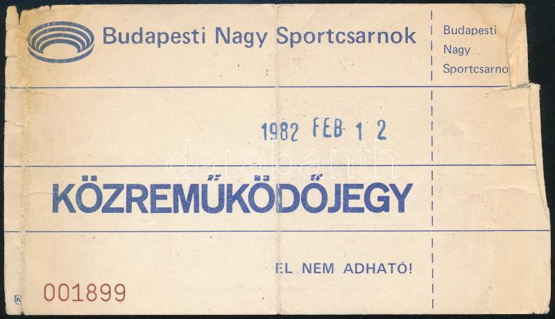 1982 Budapesti Nagy Sportcsarnok (BS), megnyitóra szóló közreműködői j... https://www.darabanth.com/de/435-Fernauktion/435.0/Kunst-Dokumente-andere-Sammelgebiete/Dokument~500019/1982-Budapesti-Nagy-Sportcsarnok-BS-megnyitora-szolo-kozremukodoi-jegy-kisse-serult-e~II2813069
