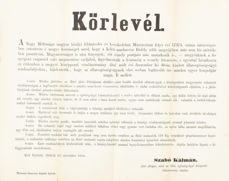 1868 Győr, Szabó Kálmán alispán által kiadott körlevél a Magyarországo... https://www.darabanth.com/de/435-Fernauktion/435.0/Kunst-Dokumente-andere-Sammelgebiete/Drucksachen~2000003/1868-Gyor-Szabo-Kalman-alispan-altal-kiadott-korlevel-a-Magyarorszagot-fenyegeto-marhave~II2779297