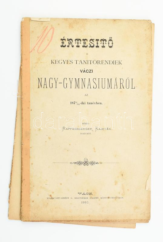 1880 Értesítő a kegyes tanítórendiek váczi nagy-gymnasiumáról az 1879/80-iki tanévben. Közli: Rappensberger Kajetán. Benne: A determinánsok elméletének és alkalmazásának elemei. Vác, Serédy G. Siketnémák Iparint.-ny., 64 p. Kiadói papírkötés, kissé foltos, sérült, szétváló fűzéssel.