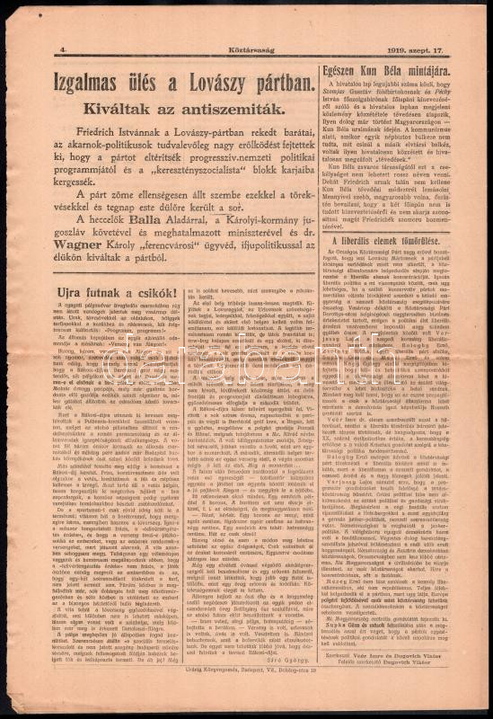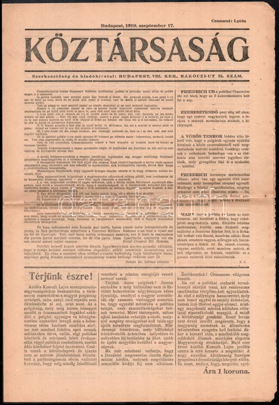 1919 A Köztársaság c. politikai napilap szeptember 17-i száma, román c... https://www.darabanth.com/de/435-Fernauktion/435.0/Kunst-Dokumente-andere-Sammelgebiete/Drucksachen~2000003/1919-A-Koztarsasag-c-politikai-napilap-szeptember-17-i-szama-roman-cenzuraval~II2821422
