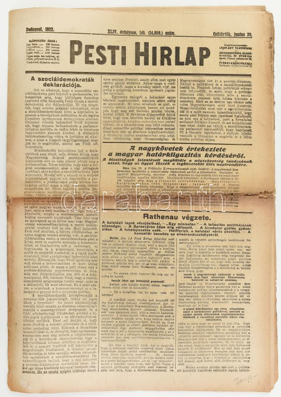 1922 Pesti Hírlap XLIV. évf. 145. sz., 1922. jún. 29., a címlapon: "A nagykövetek értekezlete a magyar határkiigazítás kérdéséről", kissé sérült, 20 p.