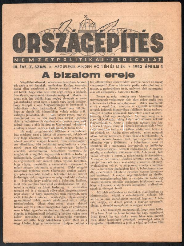 1943 Országépítés. Nemzetpolitikai szolgálat. 1943. ápr. 1. III. évf. ... https://www.darabanth.com/de/435-Fernauktion/435.0/Kunst-Dokumente-andere-Sammelgebiete/Drucksachen~2000003/1943-Orszagepites-Nemzetpolitikai-szolgalat-1943-apr-1-III-evf-7-sz-serult-szaka~II2823099
