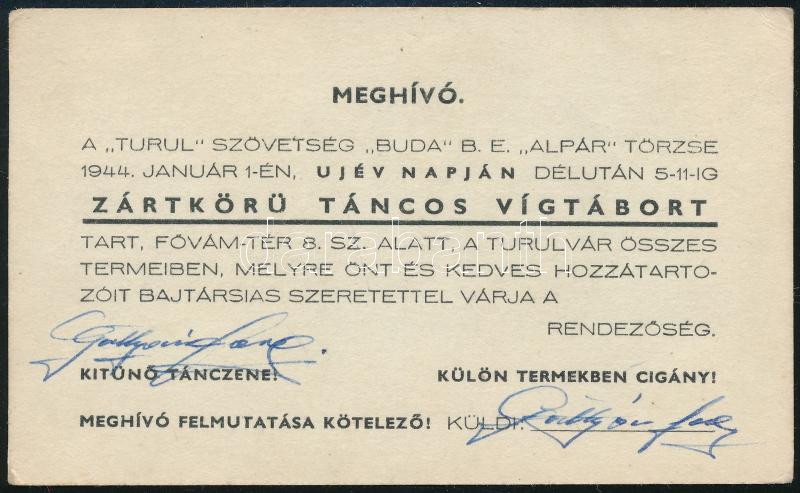 1944 Bp., A Turul Szövetség meghívója újévi zárt körű táncos vígtáborr... https://www.darabanth.com/de/435-Fernauktion/435.0/Kunst-Dokumente-andere-Sammelgebiete/Drucksachen~2000003/1944-Bp-A-Turul-Szovetseg-meghivoja-ujevi-zart-koru-tancos-vigtaborra-Turulvar-Fov~II2822471