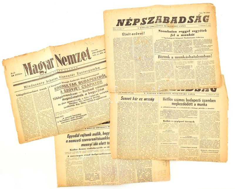1956 össz. 4 db újság a forradalom és szabadságharc idejéből és a közvetlen azt követő időszakból: Magyar Nemzet, okt. 31. és Népszabadság, nov. 17., 20. és 27. lapszámai, szakadásokkal, sérülésekkel.