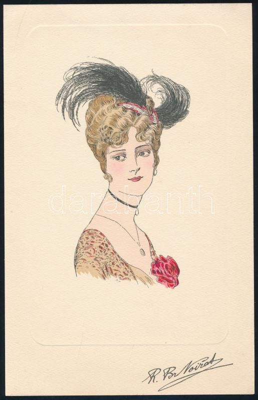 R. B. Noirat: Kalapos hölgy, színes nyomat, 23x15 cm https://www.darabanth.com/de/435-Fernauktion/435.0/Kunst-Dokumente-andere-Sammelgebiete/Drucksachen~2000003/R-B-Noirat-Kalapos-holgy-szines-nyomat-23x15-cm~II2800704