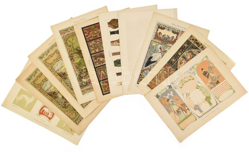 cca 1900-1910 Dekorative Vorbilder, össz. 10 db, szecessziós, historizáló és japonizáló ornamentikával, illusztrációval díszített nyomat. Egyik Georg Sturm (1855-1923), egy másik František (Franz) Kupka (1871-1957) műve. Egy lapon Anton Seder (1850-1916) üvegterveivel. Helyenként lap széle kissé szakadt és kissé foltos. Lapméret: kb. 35x25 cm, egy lap 35x50 cm