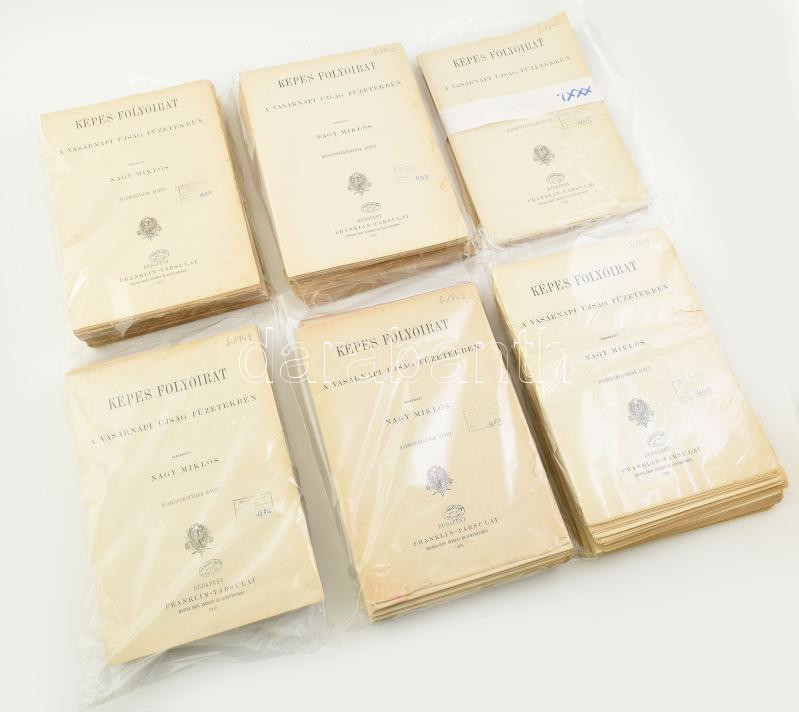 cca 1900 Képes folyóirat, a Vasárnapi Ujság füzetekben, szerk. Nagy MIklós, Bp., Franklin 6 évfolyam: 29., 30., 31., 32., 33. és 36. kötet, számos érdekes írással és illusztrációval, intézményi bélyegzőkkel, néhány kevés lap kissé szakadt, kötés nélkül, részben hiányos (31. kötet többsége hiányzik).