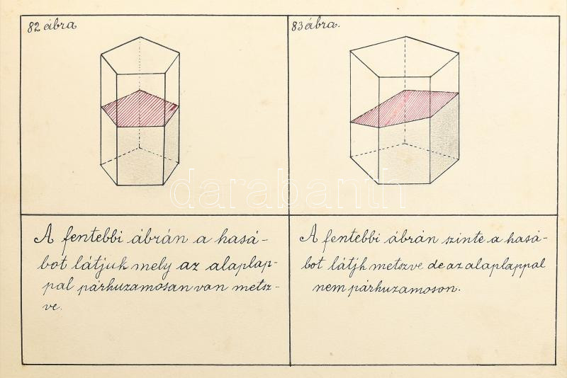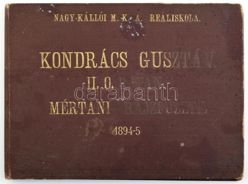1894-1895 Kondrács Gusztáv II. osztályos r. tanuló mértani rajzfüzete 1894-5. Nagy-Kállói M. Kr. A. Reáliskola. Benne különféle kézzel rajzolt ábrákkal, (összesen 97 ábra), és jegyzetekkel, közte 1 az ezredéves kiállításon bemutatott tárgy ábrájával (97 ábra. Symetrikus test.) Kopott aranyozott haránt-alakú egészvászon-kötés, 30 sztl. lev.