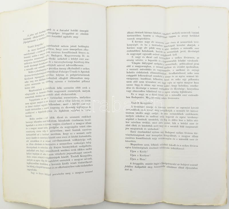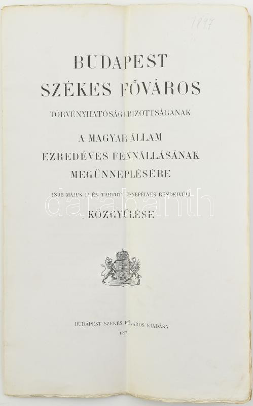 1896 Budapest Székesfőváros törvényhatósági bizottságának a Magyar Állam ezredéves fennállásának megünneplésére 1896 május 11-én tartott ünnepélyes rendkívüli közgyűlése. Bp., 1897. 20p. Folio
