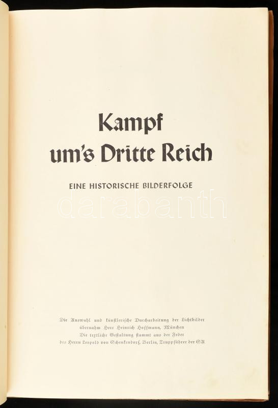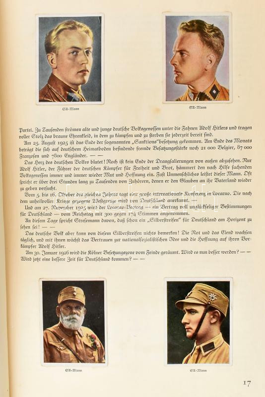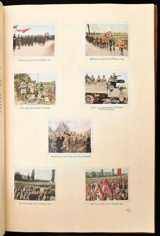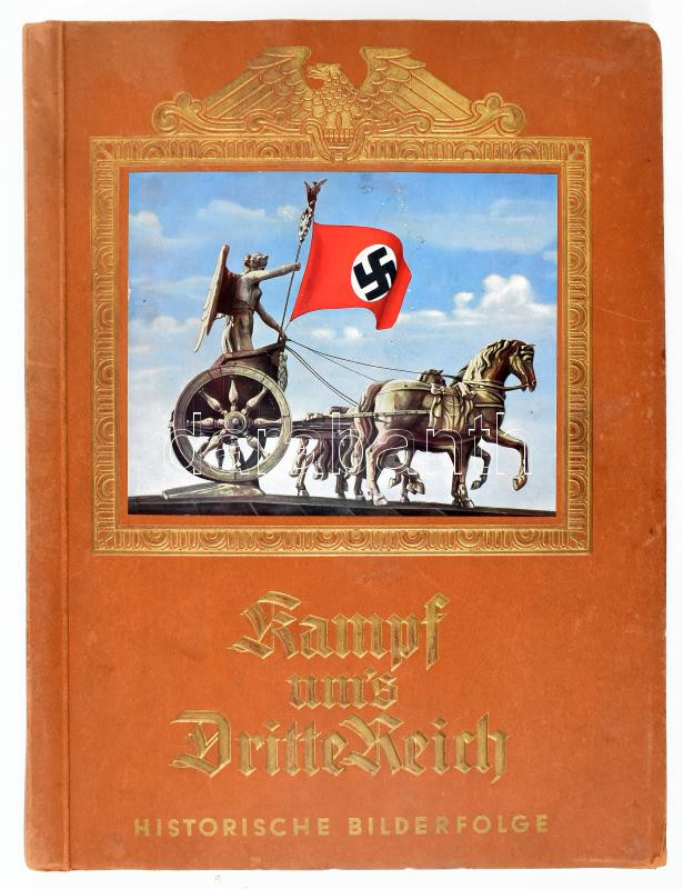 1933 Kampf ums Dritte Reich (Harc a Harmadik Birodalomért), német gyűjtőkép-album, sok beragasztott képpel (kb. 10-20 db hiányzik), díszes albumban, a borítón némi kopással, helyenként kisebb foltokkal, de összességében jó állapotban. Ritkaság!
