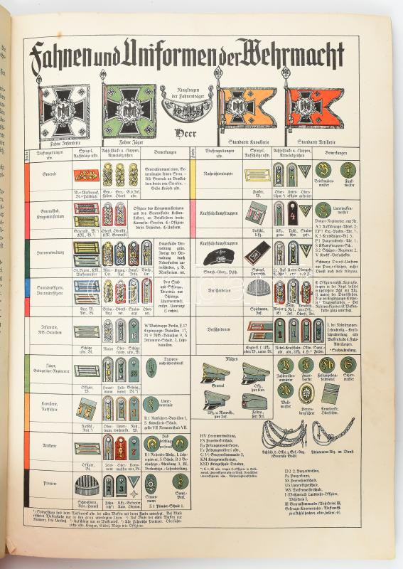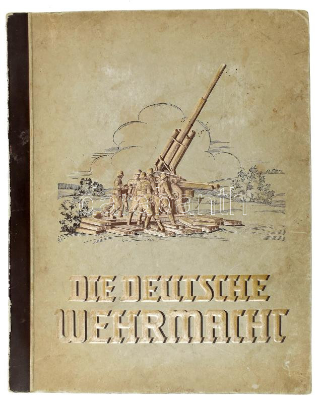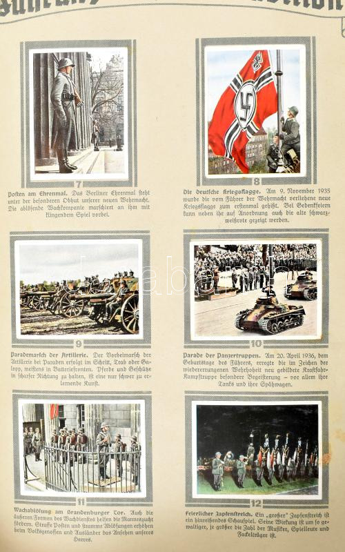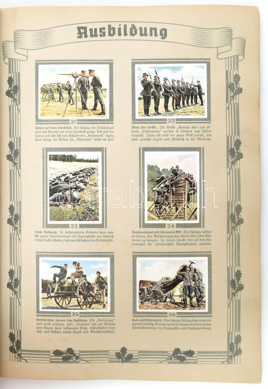 1936 Die Deutsche Wehrmacht - a német hadsereget bemutató cigarettakép-gyűjtőalbum, sok beragasztott képpel (kb. 15-20 db hiányzik), díszes albumban, a borító kissé kopott, egyébként jó állapotban. Ritkaság!