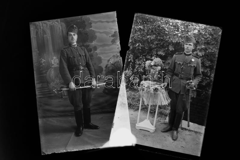 Beschreibung: Huszár portrék, egyik ügyességi jelvénnyel, 2 db régi üvegnegatív, 15x10 cm