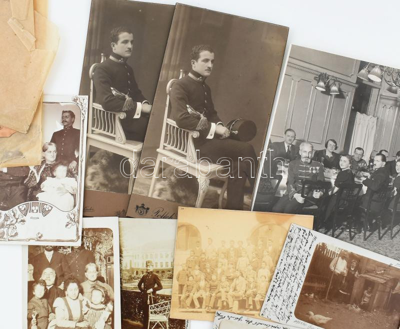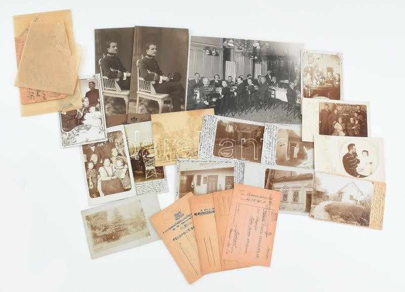 cca 1895-1945 Katonai fénykép és levelezőlap gyűjtemény, egy családból: tábori posta, fotólapok, keményhátú kabinetfotók, stb. (közte civil családi képek is), össz. 21 db