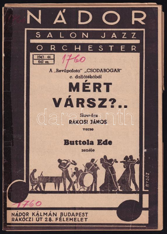 1944 Rákosi János - Buttola Ede: Mért vársz?... Slow-fox. Bp., Nádor Kálmán. A borító Byssz Róbert munkája. Sérült papírkötés, a lapok kijárnak.