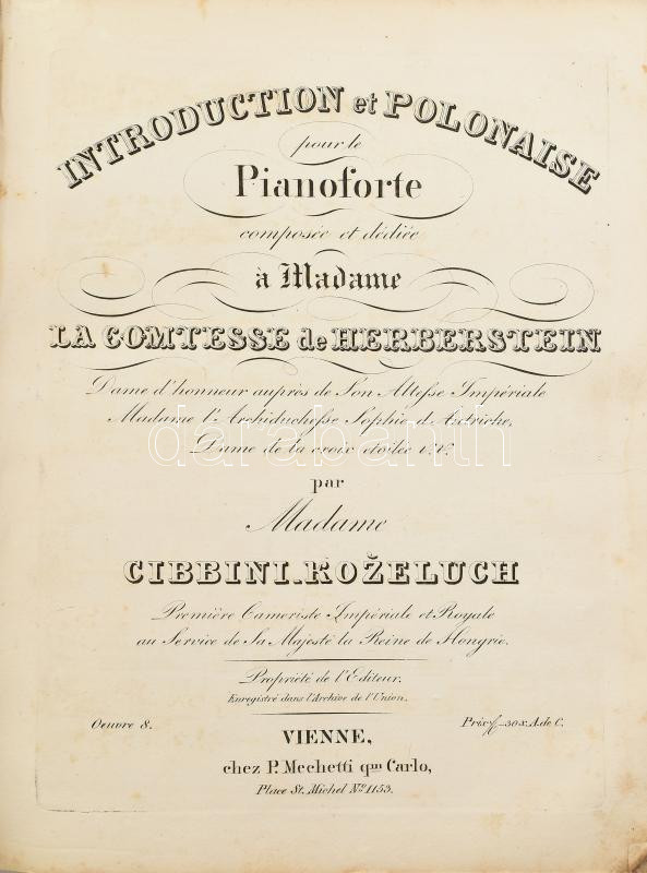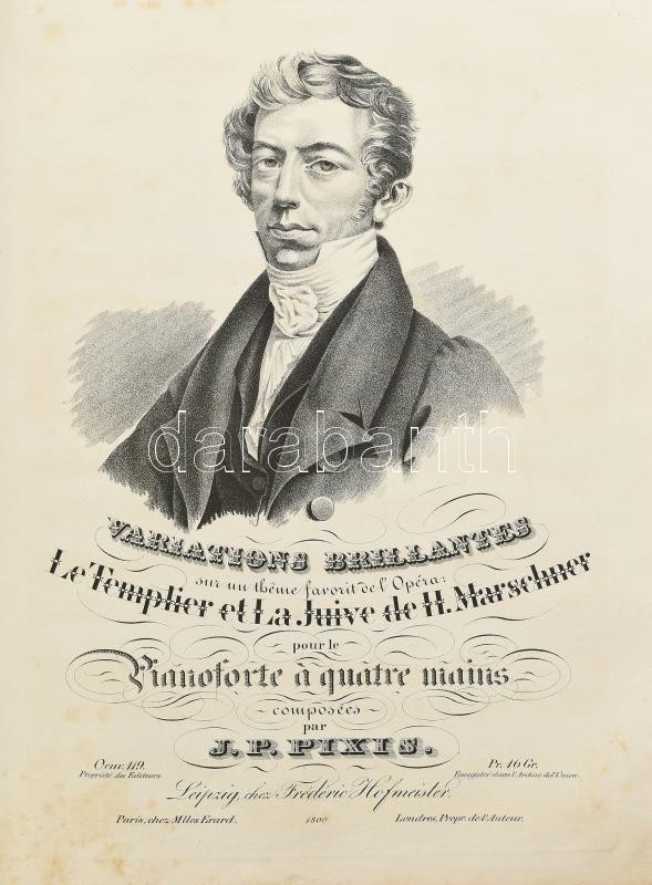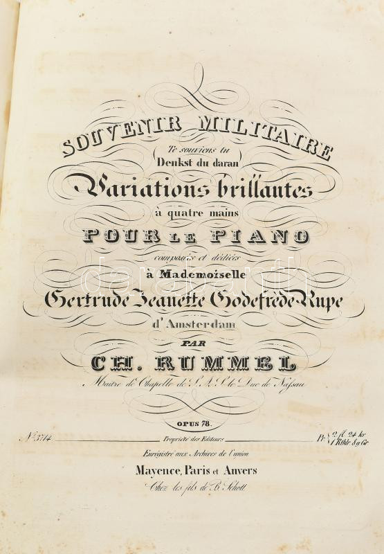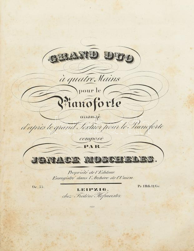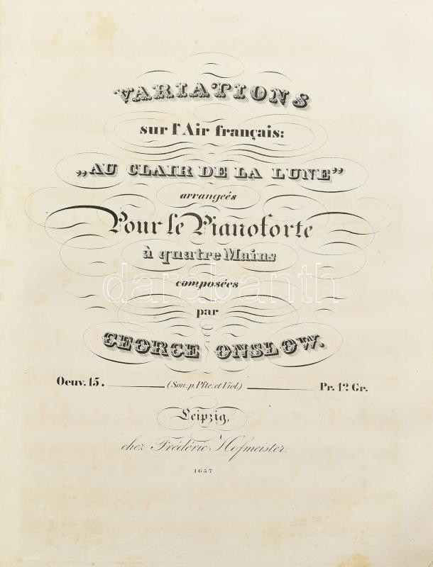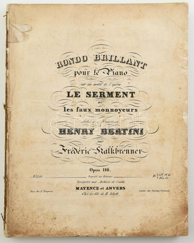 cca 1840-1860 Kottagyűjtemény, benne: Henry Bertini - Fréderic Kalkbrenner: Le Serment, ou Les Faux Monnayeurs. Op. 116. Anvers [Antwerpen], én., Mayence, 13 p.; Herberstein, [Maria Barbara von] - [Catherina] Cibbini-Kozeluch: Introduction et polonaise pour le pianoforte. Vienne, P. Mechetti,7 p.; Ignace Moscheles: Grando Duo á quatre Mains pur le pianoforte. Leipzig, Fréderic Hofmeister, 43 p.; George Onslow: Introduction et variations sur l'air "Au Clair de la lune." Leipzig, Fréderic Hofmeister, 11 p.; J. P. Pixis: Le Templier et la Juive de Marschner, pour le piano-forte. op. 119. Leipzig, Fréderic Hofmeister, 17 p.; Gertrude Jeannette Godfréde Rupe d'Amsterdam - Ch[ristian] Rummel: Souvenir militaire (Denkst du daran). Variariations brillantes. Op. 78. Anvers [Antwerpen], én., Mayence, 31 p.; Emmeline Böddinghaus - Ferd[idnand] Ries: Variations brilliantes. Oeuv. 170. Leipzig, Breitkopf & Härtel, 22 p. Papírkötés, borító nélkül, az utolsó 10 levél, a kotta címlapja után levált, foltos.