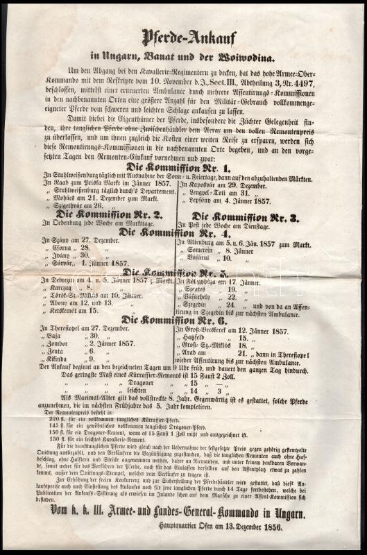 1856 Magyarország, Bánát és Vajdaság területén lóvásárlási hirdetmény ... https://www.darabanth.com/de/435-Fernauktion/435.0/Kunst-Dokumente-andere-Sammelgebiete/Plakat~2000004/1856-Magyarorszag-Banat-es-Vajdasag-teruleten-lovasarlasi-hirdetmeny-nemet-nyelven-29x~II2821601