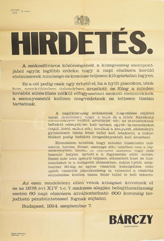 1914 Bárczy főpolgármester hirdetménye a vásárokon árult élelmiszerek ... https://www.darabanth.com/de/435-Fernauktion/435.0/Kunst-Dokumente-andere-Sammelgebiete/Plakat~2000004/1914-Barczy-fopolgarmester-hirdetmenye-a-vasarokon-arult-elelmiszerek-tarolasa-targyaban~II2821375