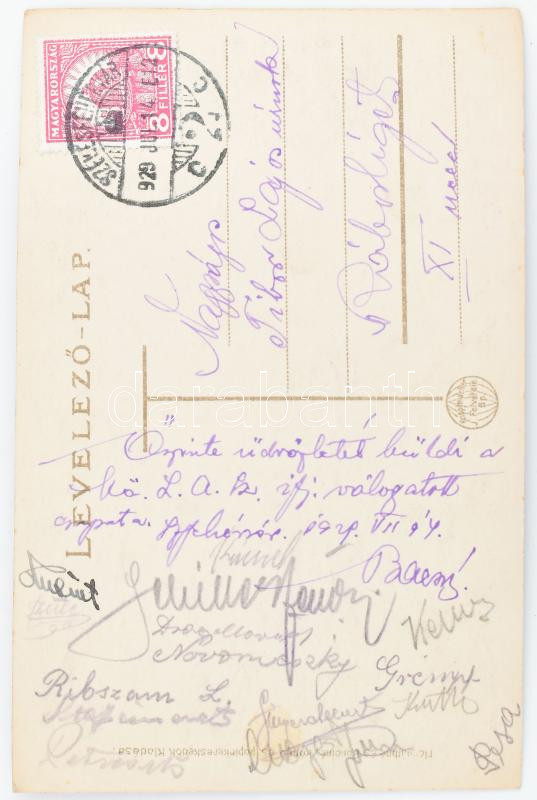 1929 Magyar LASZ ifjúsági válogatott labdarúgók tagjai által aláírt képeslap Tibor Lajos (1883-1850) sportvezető, a magyar labdarúgó-válogatott volt szövetségi kapitányának Ribszam. Novomeszky, Petrosik, Keller, és mások / Autograph signed postcard of the National Hungarian youth football team