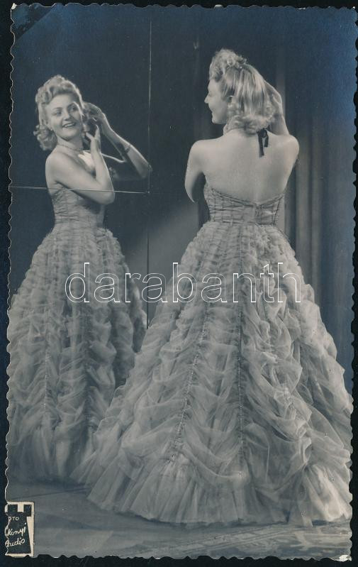 Beschreibung: 1948 Zentai Anna autográf sorai Várkonyi matricával jelzett, róla készült estélyi ruhás fotóján