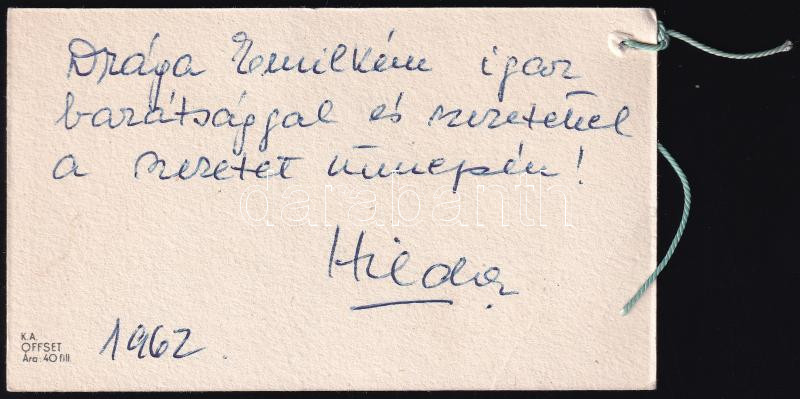 Beschreibung: Gobbi Hilda (1913-1988) színésznő autográf sorai üdvözlő kártyán