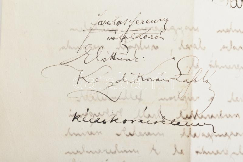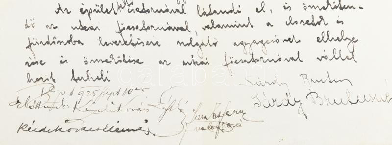 Kézdi-Kovács László (1864-1942) festőművész, műkritikus; fia, Kézdi-Kovács Elemér (1898-1976) festőművész, Sárdy Brutus (1892-1970) festőművész, restaurátor és Sárdy Brutusné, szül. Kézdi-Kovács Lenke, Kézdi-Kovács László lánya 2-2 autográf aláírása a Bp., Dósa u. 17 (Rómaifürdő) cím alatt építendő ház szerződésén Két és fél kézzel írt oldal.
