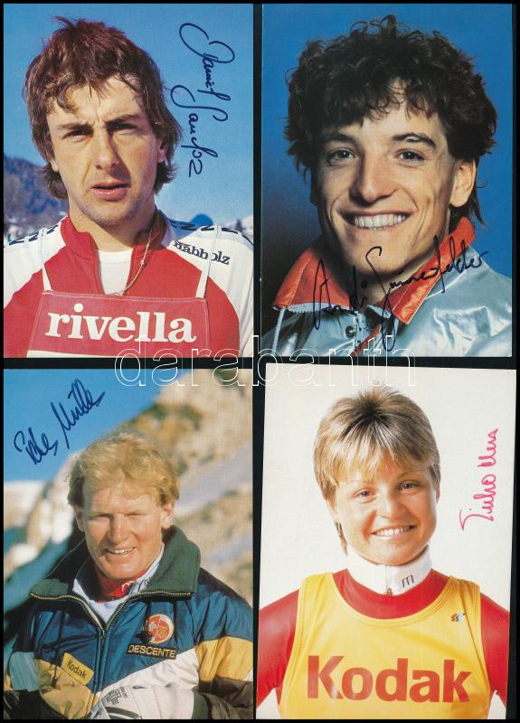 Sí bajnokok, olimpiai érmesek által aláírt képeslapok Andi Grünenfelder, Peter Müller, Erika Hess, Daniel Sandor / Ski champions autograph signed postcards