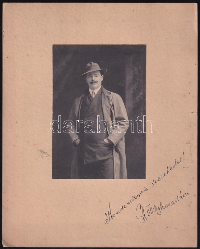 cca 1910-20 Zöldy (Zöldi) János Marci (1877 k.-1922) híres hegedűművész, az első úri cigányprímás, korábbi honvéd főhadnagy dedikált fotója, kartonra ragasztva, 25,5×20,5 cm.