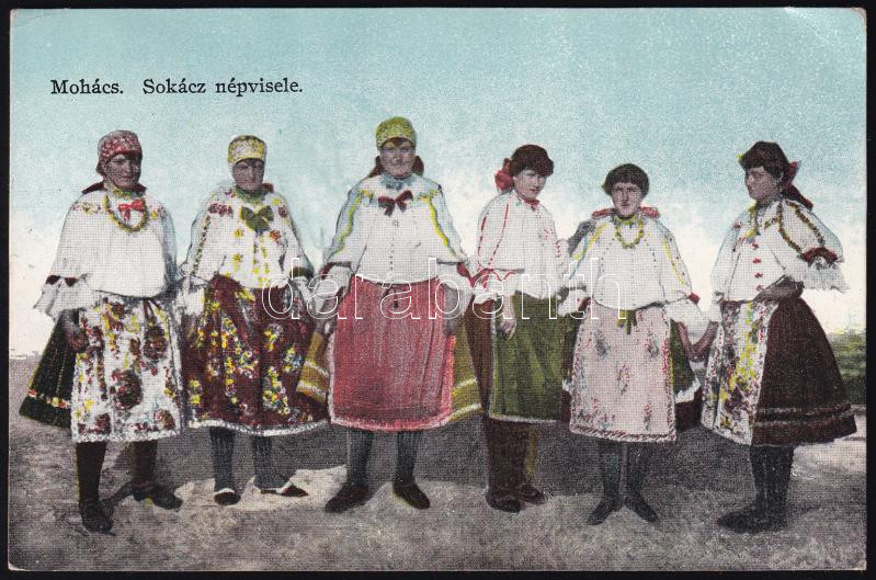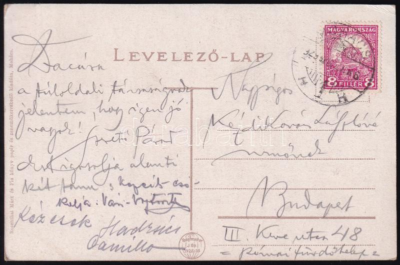 cca 1929 Kézdi-Kovács László (1864-1942) festőművész autográf sorai feleségének címezve, valamint további neves festőművészek autográf aláírásaival és rövid üdvözletével: Vári Vojtovits Zoltán (1890-1953) és Hadzsics Camilló Gábor (1894-?), mohácsi sokác népviseletet bemutató képeslapon, 9x13,5 cm