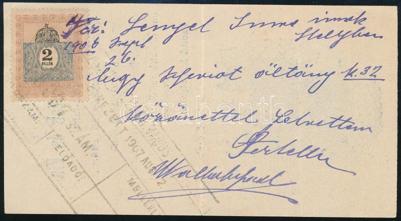 Beschreibung: 1906 Késmárk, Wallentin Jakab és Fia férfiruha-üzlet számolócédula, hátoldalán kézzel írt nyugta 2 f okmánybélyeggel