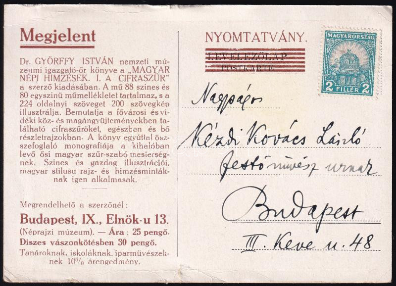 1930 Györffy István: Magyar népi himzések I. A cifraszűr c. könyvét hirdető reklám megrendelőlapja, Kézdi-Kovács László (1864-1942) festőművésznek, újságírónak küldve, apró szakadással, 10x14 cm