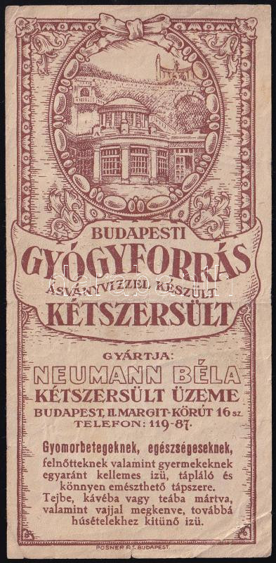 Budapesti gyógyforrás ásványvízzel készült kétszersült, gyártja: Neuma... https://www.darabanth.com/de/435-Fernauktion/435.0/Kunst-Dokumente-andere-Sammelgebiete/Werbungen~500023/Budapesti-gyogyforras-asvanyvizzel-keszult-ketszersult-gyartja-Neumann-Bela-Bp-Margi~II2816434