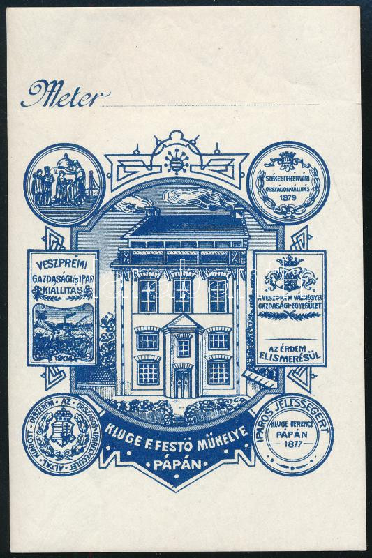 cca 1905 Kluge F. pápai szobafestő fametszetes reklámcédulája a műhely... https://www.darabanth.com/de/435-Fernauktion/435.0/Kunst-Dokumente-andere-Sammelgebiete/Werbungen~500023/cca-1905-Kluge-F-papai-szobafesto-fametszetes-reklamcedulaja-a-muhely-epuletevel-hullamo~II2821266
