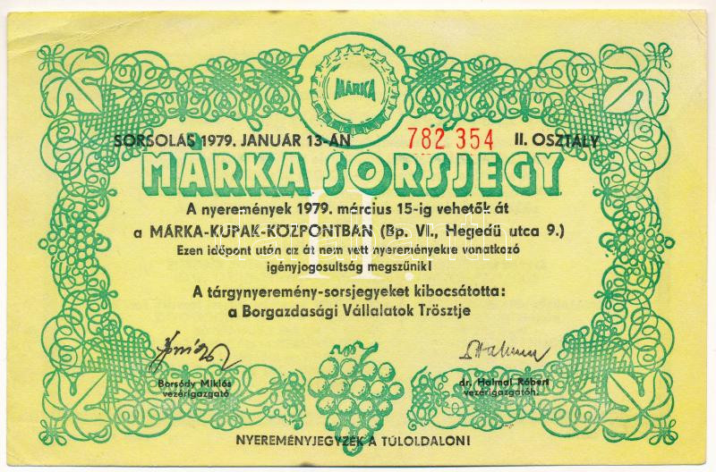 1979. "Márka Sorsjegy" II. osztályú sorsjegy T:I- https://www.darabanth.com/de/435-Fernauktion/435.0/Numismatik/Aktien-und-Tickets~1000005/1979-Marka-Sorsjegy-II-osztalyu-sorsjegy-TI-~II2813406