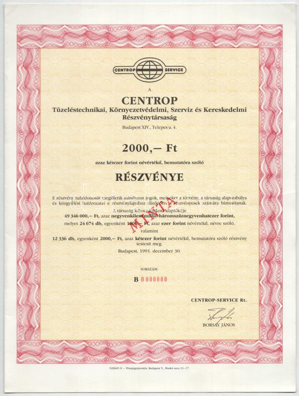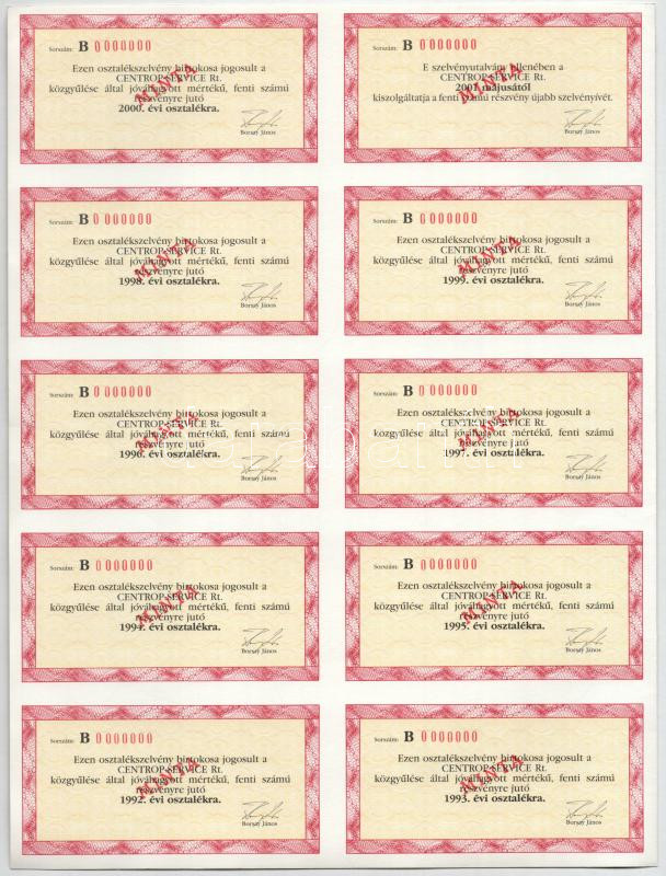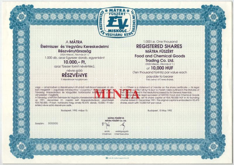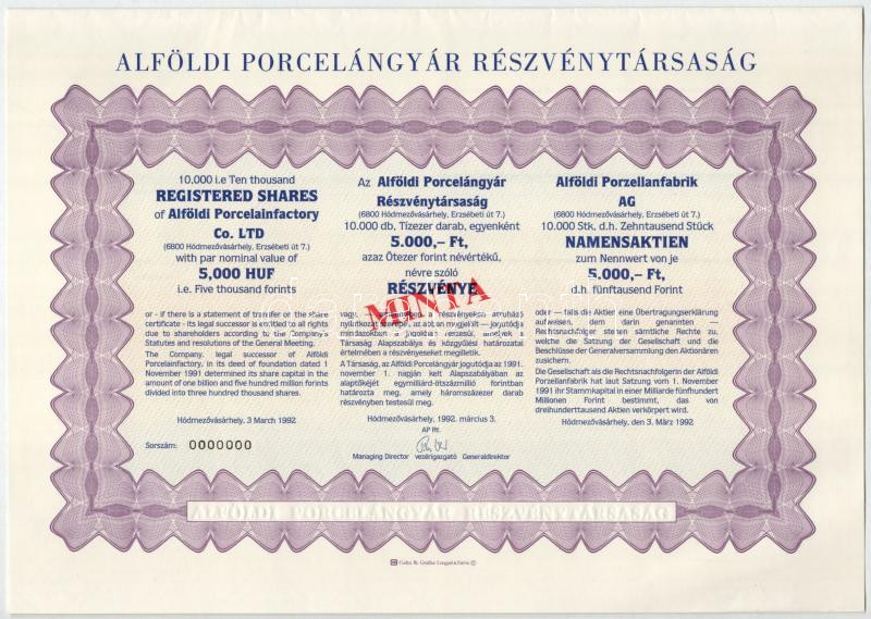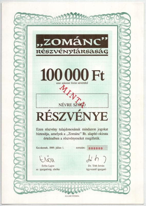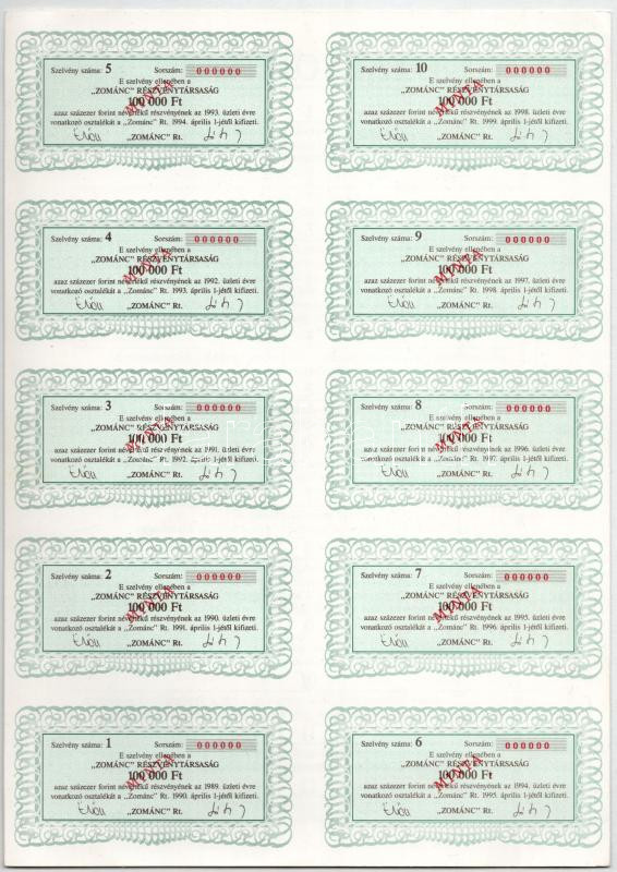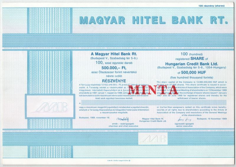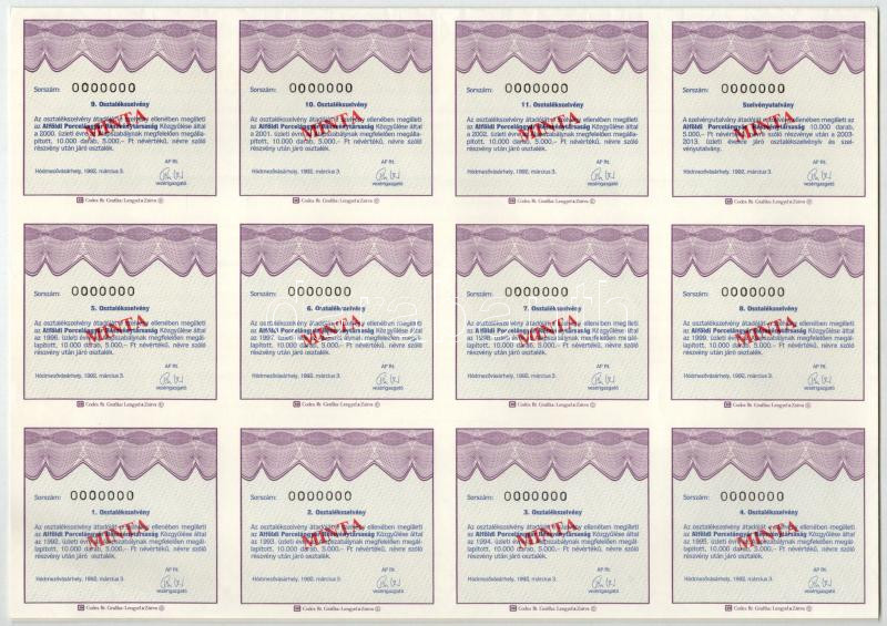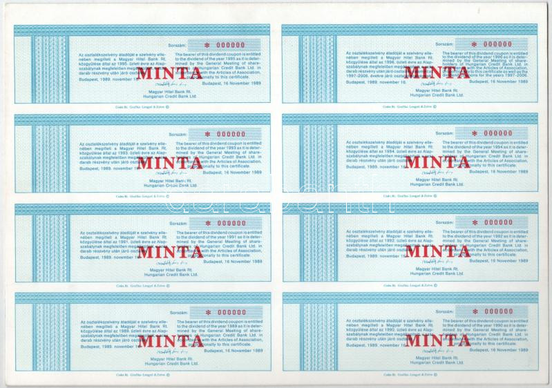 1989-2002. 16 darab magyar részvény "MINTA" felülbélyegzéssel, illetve "MINTA" perforációval, közte "Zománc Részvénytársaság", "Alföldi Porcelángyár", "Magyar Hitel Bank RT" mind szelvényekkel, közte szárazpecsét, lyukasztás T:I-,II kis sarokhajlás, egyiken folt