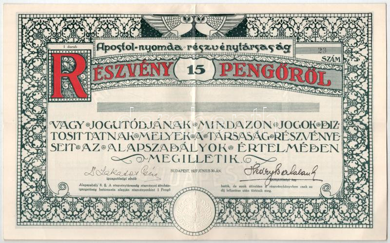 Budapest 1927. "Apostol-Nyomda Részvénytársaság" részvénye 1... https://www.darabanth.com/de/435-Fernauktion/435.0/Numismatik/Aktien-und-Tickets~1000005/Budapest-1927-Apostol-Nyomda-Reszvenytarsasag-reszvenye-15P-rol-szelvenyekkel-szarazpe~II2813218
