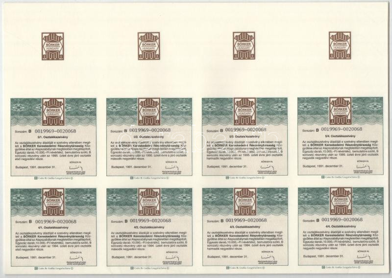 Beschreibung: Budapest 1991. "A BŐRKER Kereskedelmi Részvénytársaság" bemutatóra szóló részvénye 10.000Ft-ról (10x), kétnyelvű, szelvényekkel T:I,I-