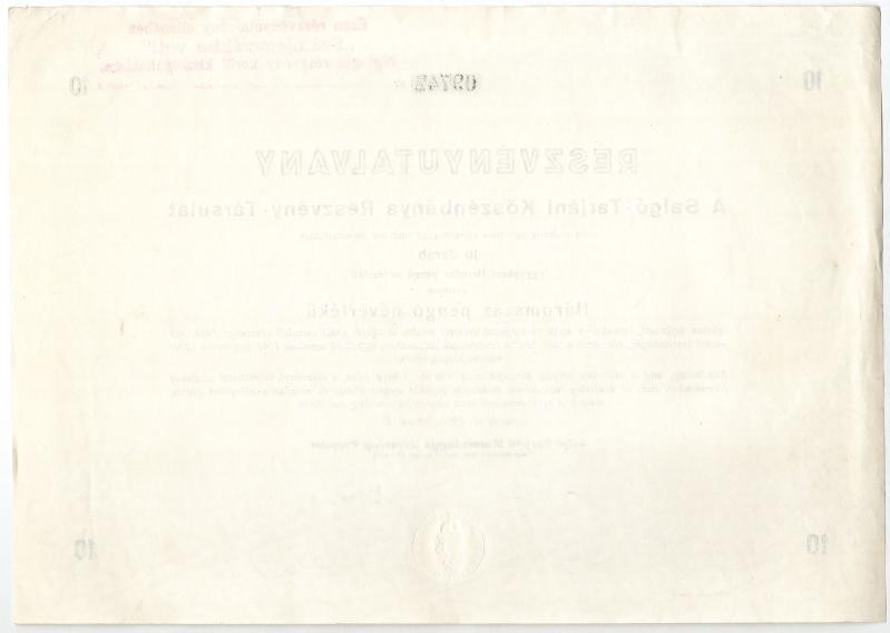 Salgótarján 1944. "A Salgó-Tarjáni Kőszénbánya Részvény-Társulat" részvényutalványa 10 darab részvényről összesen 300P értékben vízjeles papíron, "Ezen részvényutalvány ellenében - Számjegyzékbe vett - végleges részvény kerül kiszolgáltatásra" bélyegzéssel, szárazpecséttel T:1- kis szakadás