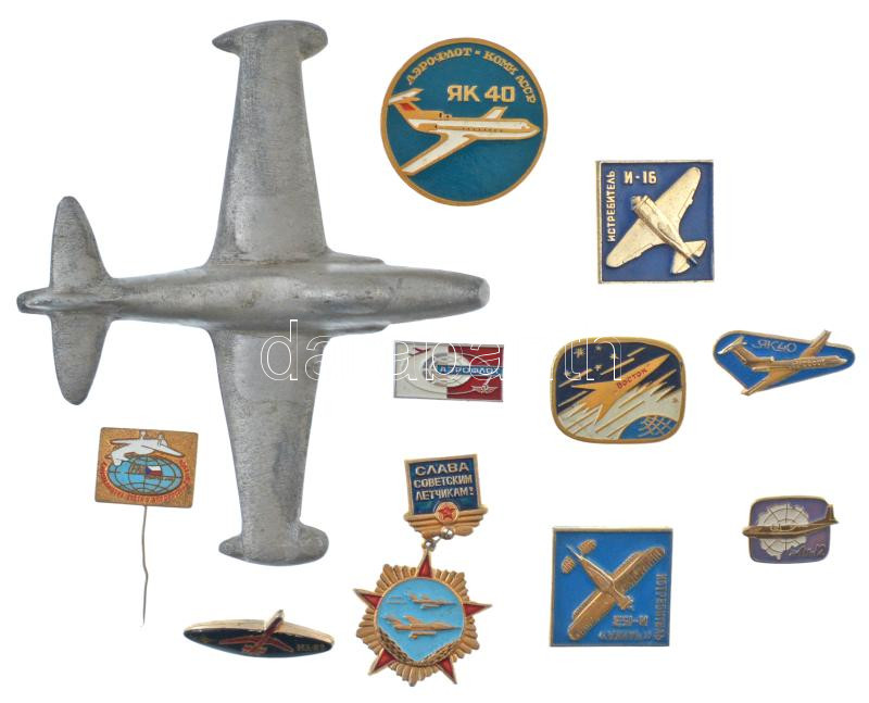 Beschreibung: 10db klf repülős fém jelvény + 11db repüléssel kapcsolatos képeslap (2xklf) + egy kisméretű fém repülőgép modell (~108x123mm) T:2