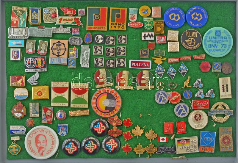 ~90 darabos vegyes külföldi kitűző tétel műanyag tálcán