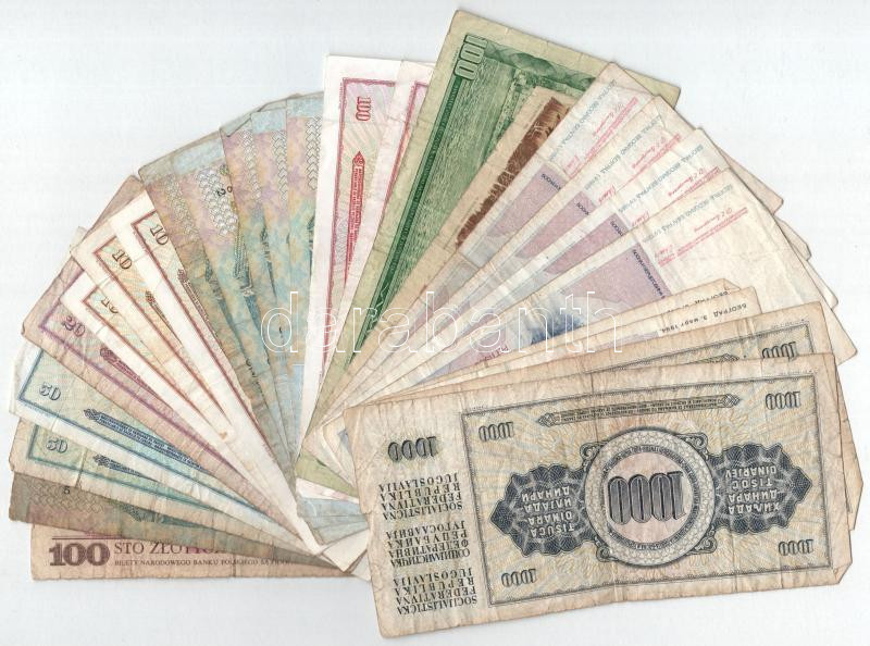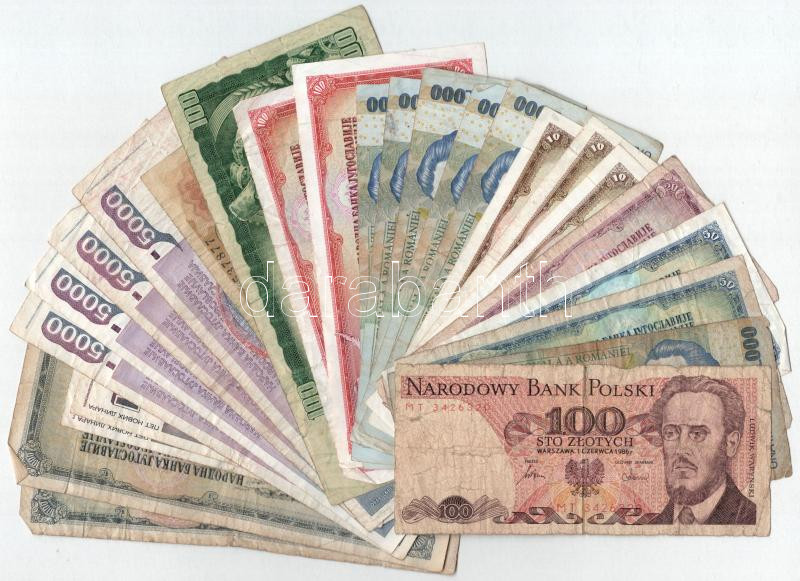 25 darabos bankjegy tétel, Románia, Jugoszlávia, Csehország, Lengyelország bankjegyei + "Intosai 2003 Eger - Officina Agriae" aranyozott melékérem műanyag tokban, tanúsítvánnyal T:I,III-IV 25 pieces banknote lot, Romania, Yugoslavia, Czeh Republic, Poland + "Intosai 2003 Eger - Officina Agriae" gilded commemorative mefallion in plastic case with certificate C:UNC,F-G
