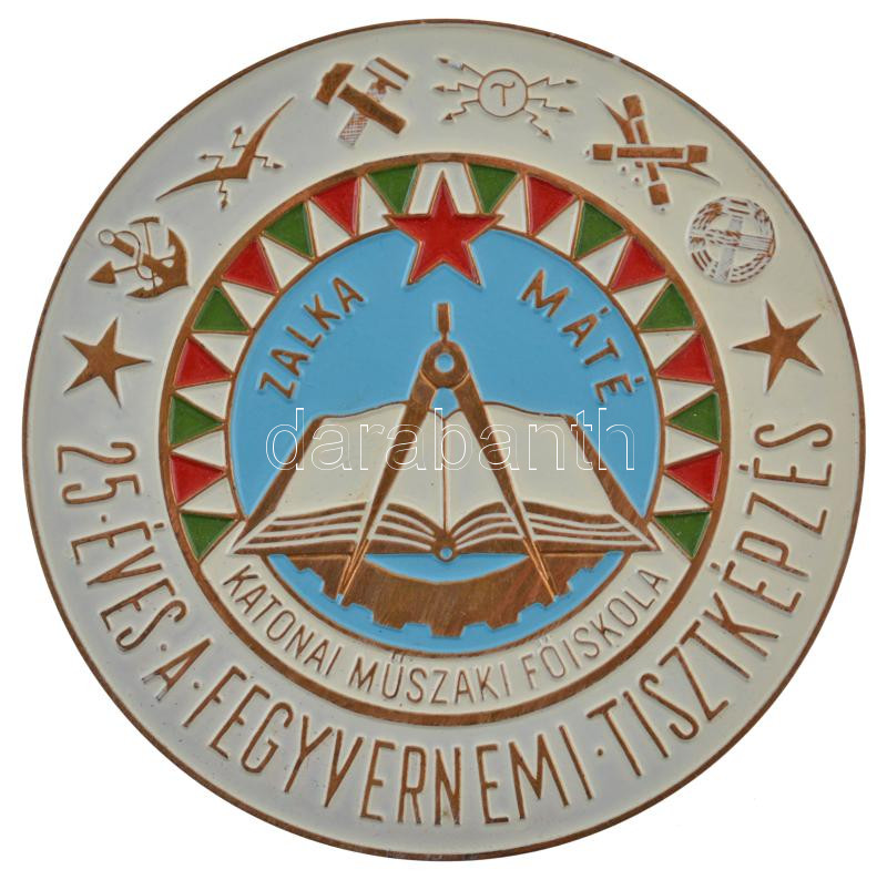 ~1970-1980. "Máté Zalka Military Technical College - 25 years of officer training in weapons" one-sided painted bronze commemorative medallion in box (80mm) C:AU