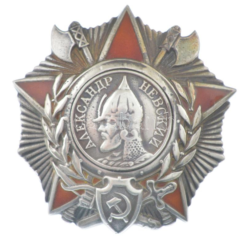Szovjetunió 1943-1991. "Alekszandr Nyevszkij Rend" aranyozott, zománcozott, jelzetlen Ag kitüntetés hátoldalán gyártói jelzéssel, csavaros hátlappal, "32963" sorszámmal T:2 kopott aranyozás, patina Soviet Union 1943-1991. "Order of Alexander Nevsky" gilt, enamelled, unmarked Ag decoration with screwback, maker's mark and "32963" serial number on the reverse C:XF worn gilt, patina