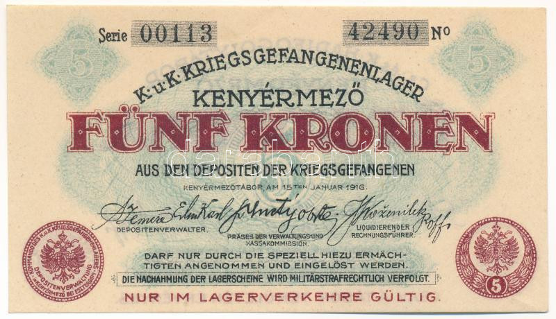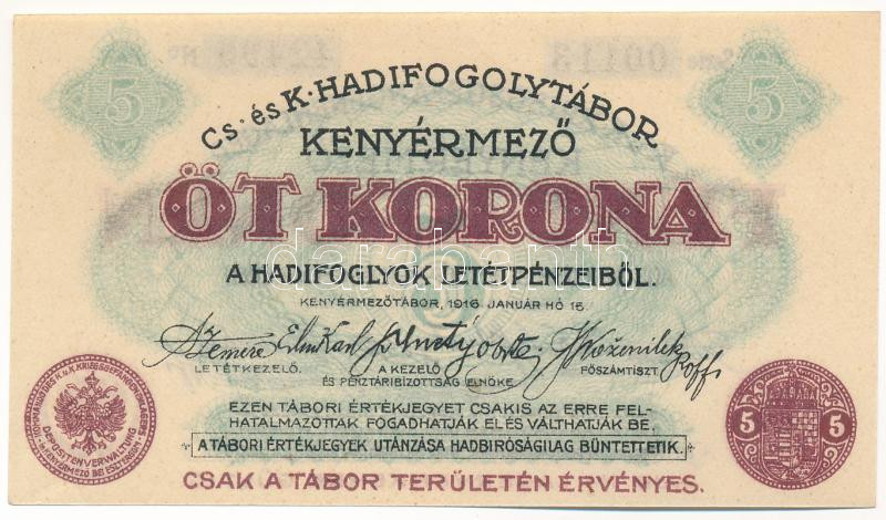Kenyérmező / Hadifogolytábor 1916. január 15. 5K arab sorozat- és sors... https://www.darabanth.com/de/435-Fernauktion/435.0/Numismatik/Notgeld-aus-Papier-und-Metall~1000006/Kenyermezo-Hadifogolytabor-1916-januar-15-5K-arab-sorozat-es-sorszammal-TI-II-fo-Adam~II2816326