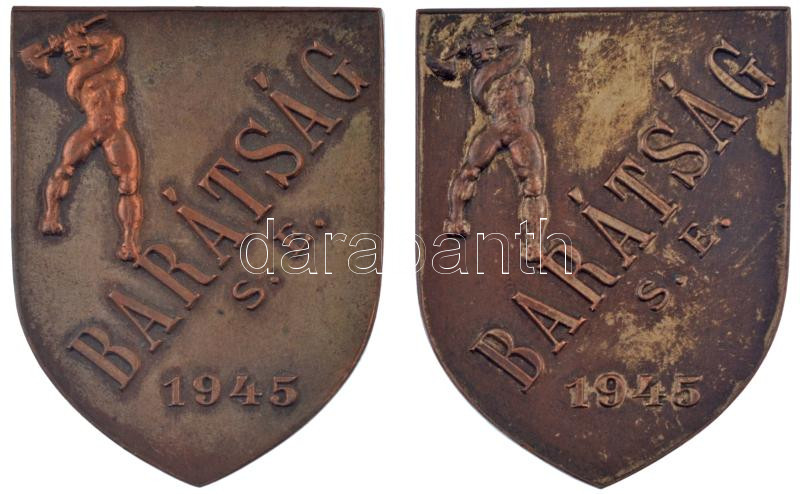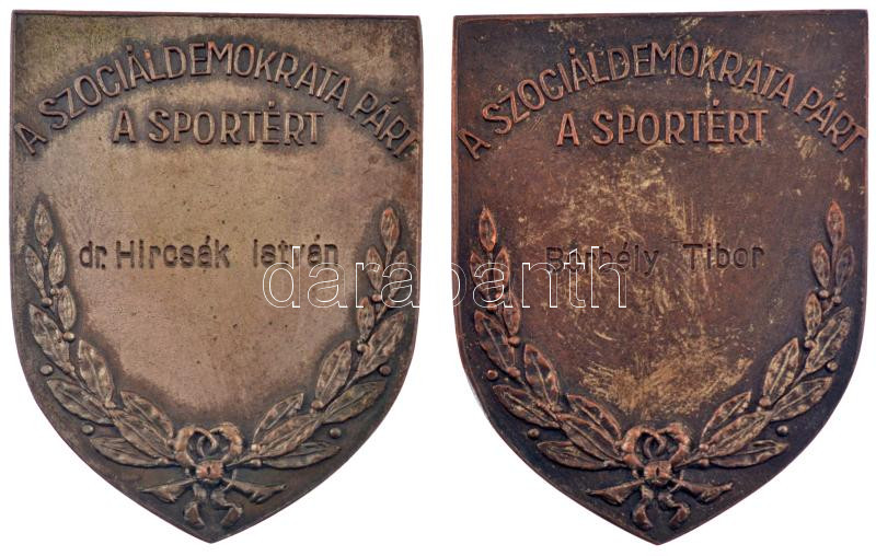1945. "Barátság S.E. / A Szociáldemokrata Párt a sportért" kétoldalas ezüstözött bronz díjplakett "Borbély Tibor, dr. Hircsák István" nevekre gravírozva (50x38mm) T:2