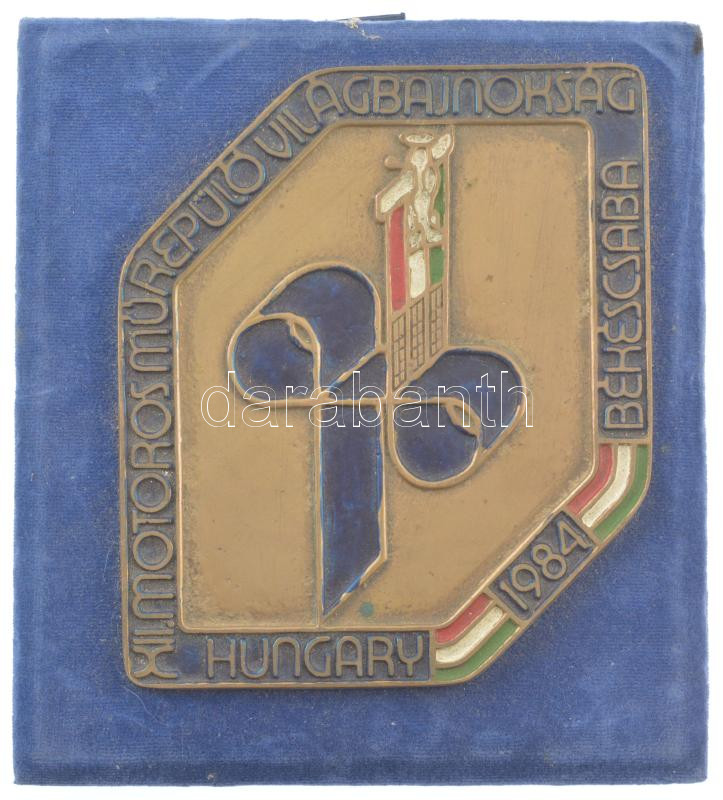 1984. "XII. Motoros Műrepülő Világbajnokság - Békéscsaba 1984" nagyméretű festett Cu emlékplakett plüss, kitámasztható képkereten (plakett: 154x133mm, keret: 195x175mm) T:2-