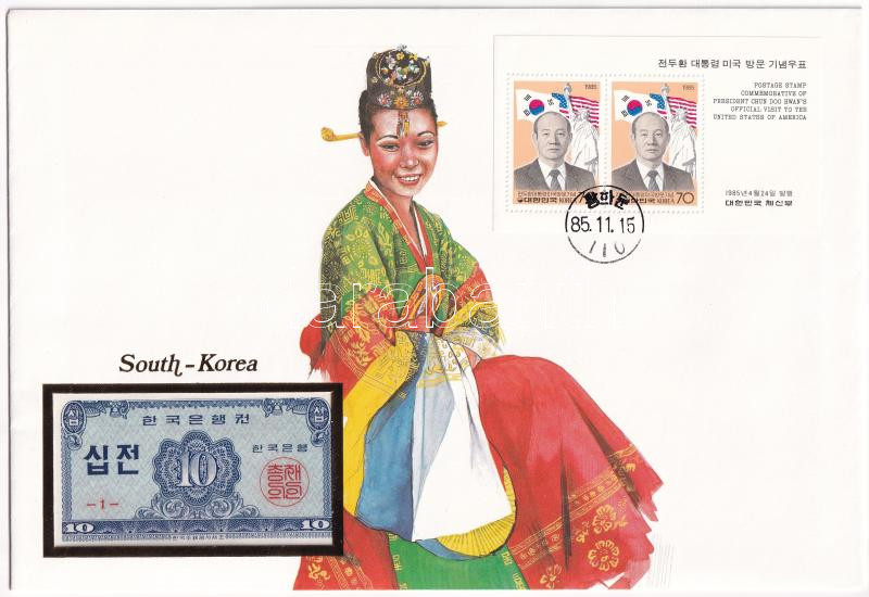 Dél-Korea 1962. 10J felbélyegzett borítékban, bélyegzéssel T:I South K... https://www.darabanth.com/de/435-Fernauktion/435.0/Numismatik/Umschlage-mit-Munzen-und-Banknoten~1000004/Del-Korea-1962-10J-felbelyegzett-boritekban-belyegzessel-TI-South-Korea-1962-10-Jeon-in-en~II2811467